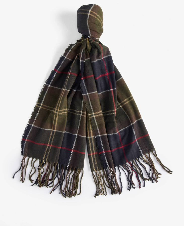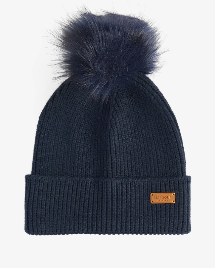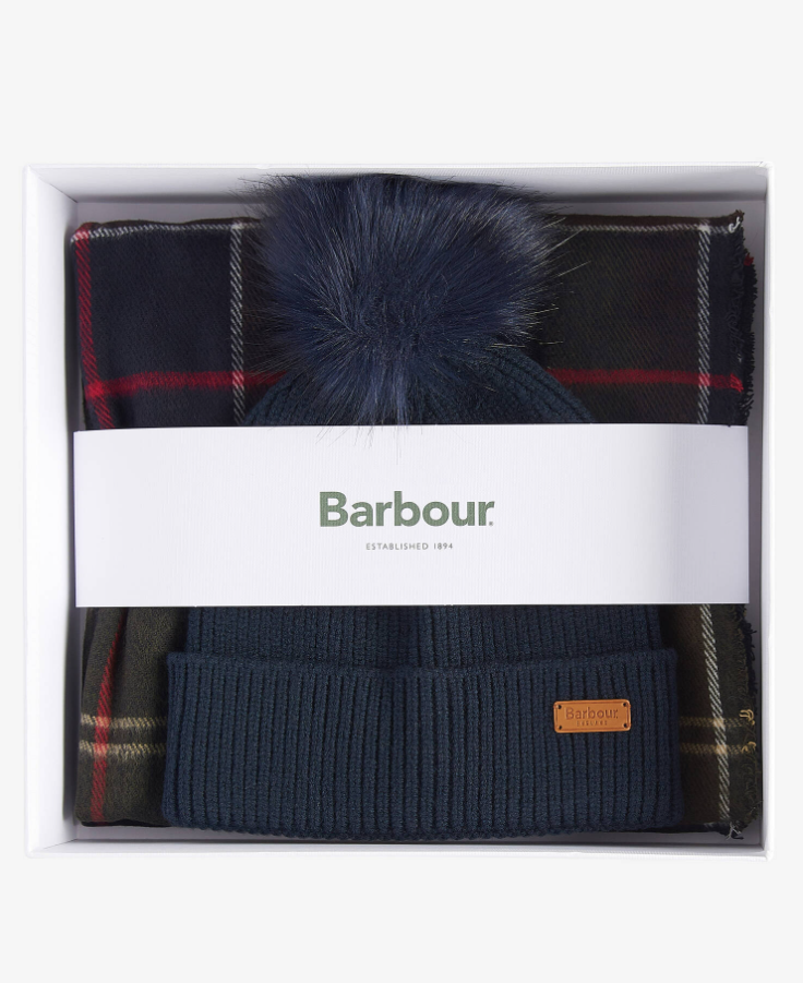 The Barbour Dover Beanie & Hailes scarf gift set includes a knitted beanie with faux fur pom and a 'Hailes' style tartan scarf with tassels. Presented in a smart gift box, the accessories are finished with a Barbour embossed badge to the hat.