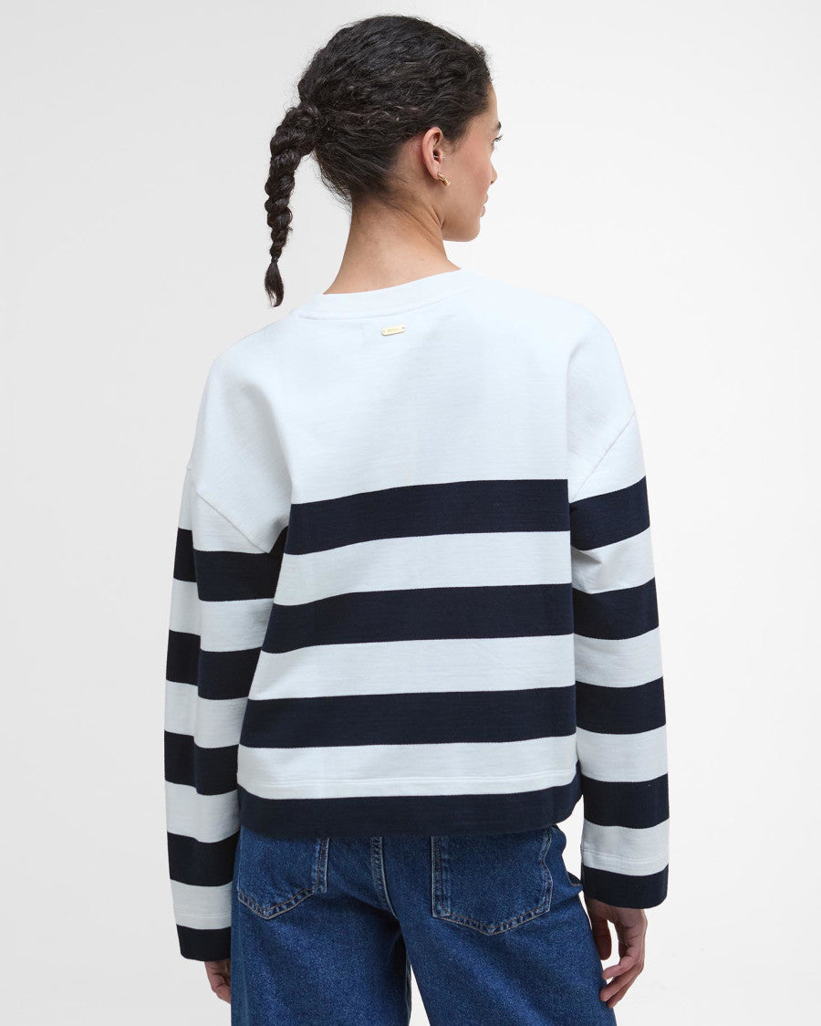 Introducing the Barbour Faye Striped Sweatshirt – the perfect blend of comfort and style with a touch of playful charm. Crafted in a relaxed fit with yarn-dyed stripes, it features a unique mock Dorito neck detail, delicate chest embroidery, and a sleek metal ID bar at the back. Ideal for cosy days when you want effortless style with a hint of sophistication.