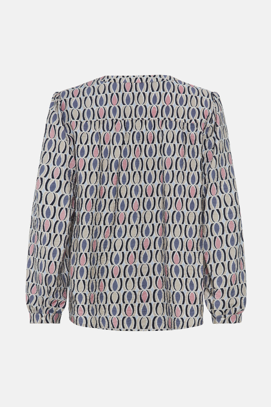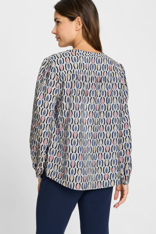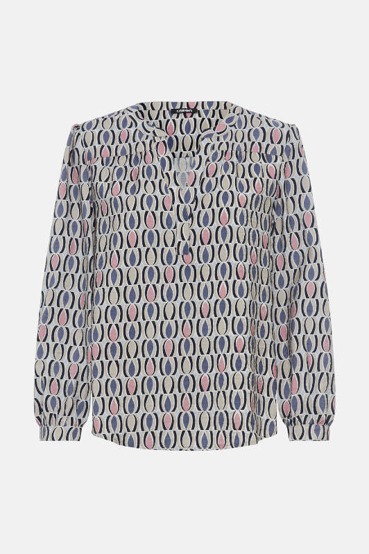 With its tunic neckline and graphic all-over pattern, this blouse brings a fresh twist to any look. The modern, slightly tailored shape subtly accentuates the figure, while the long sleeves with cuff slits add a classic touch. The blend of viscose and polyamide offers comfortable wear with a light drape. The length is approximately 62 cm.