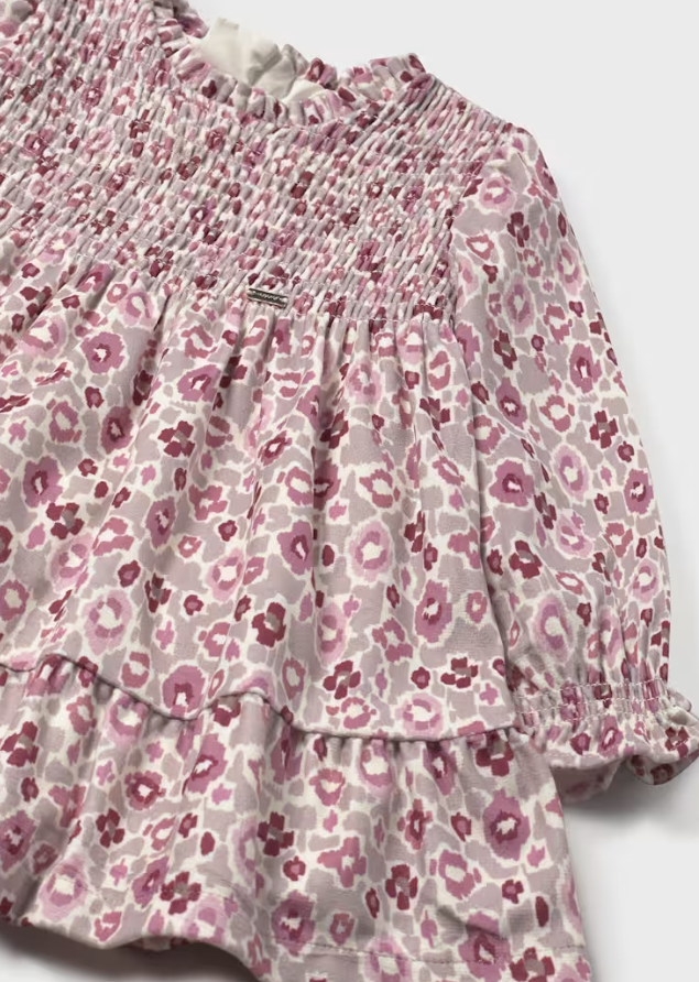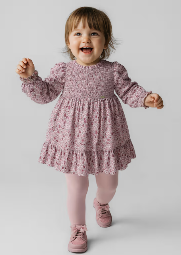 Long sleeved Dress for baby. Central rear zip fastening with concealed zip. Includes an inner lining. This model has honeycomb detailing. Gathered and ruffled design. Patterned design.