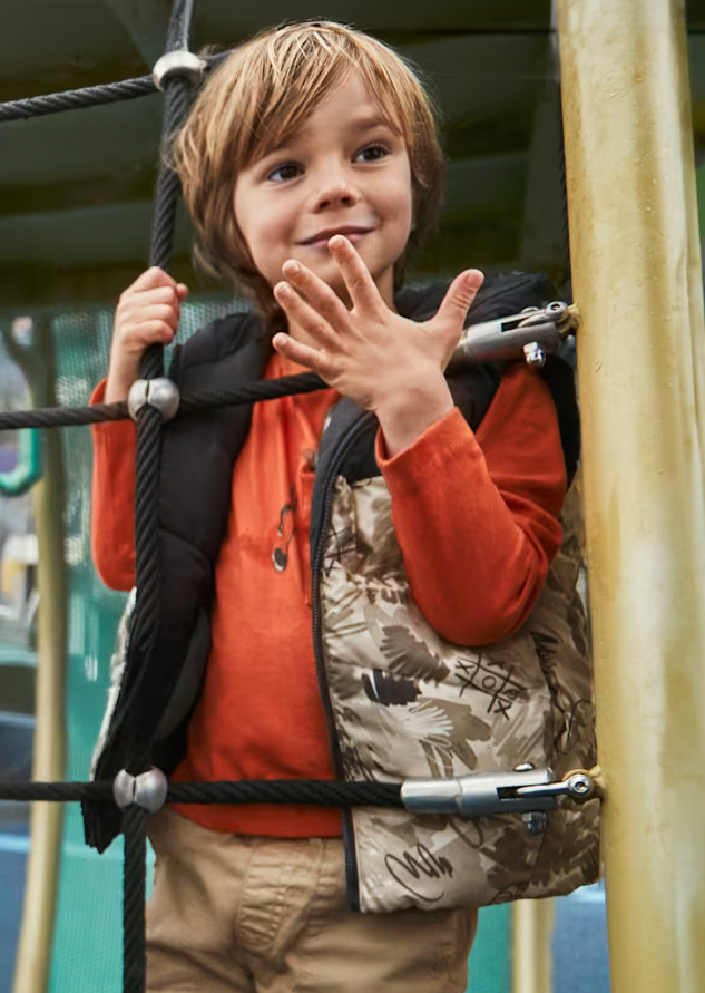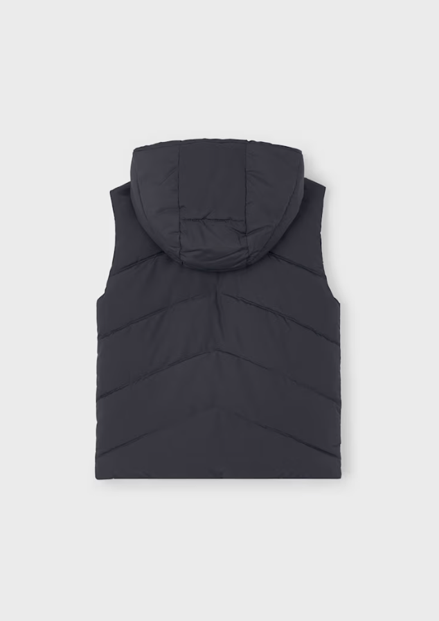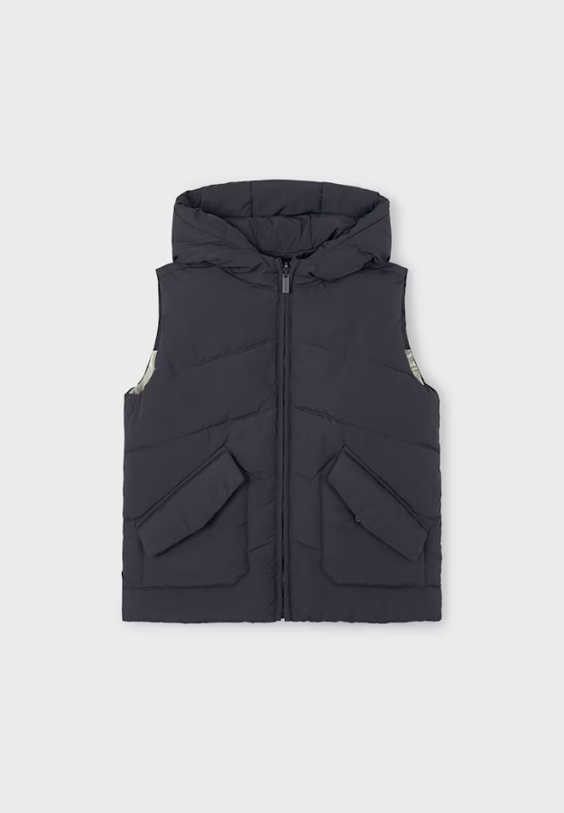Contains recycled polyester. Gilet for boy. Hooded collar. Textile exterior with quilted effect. Includes an inner lining. This is a reversible item.