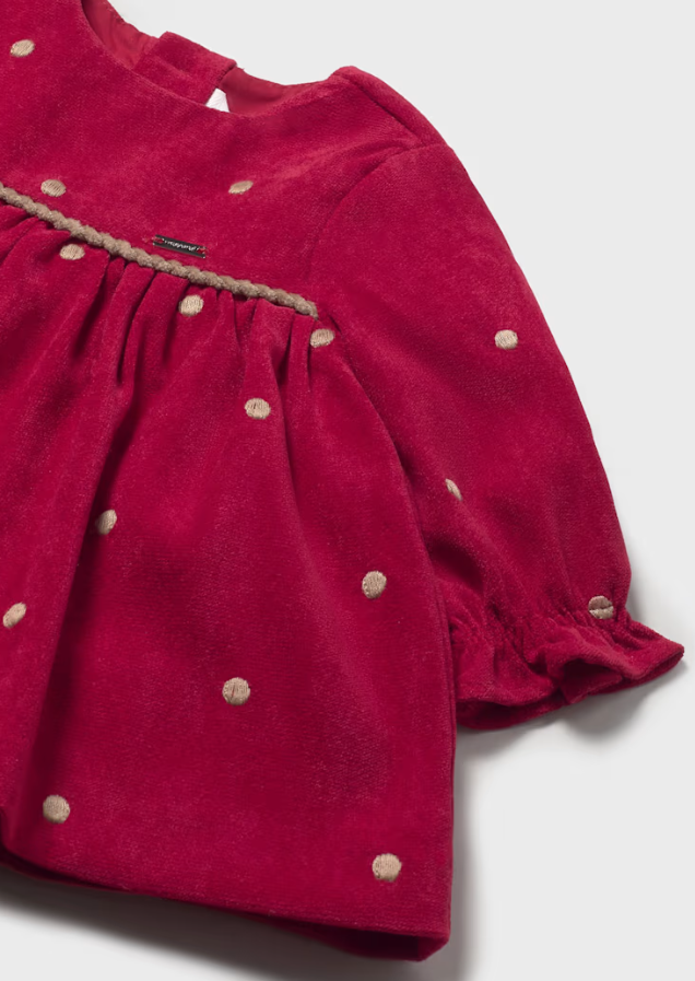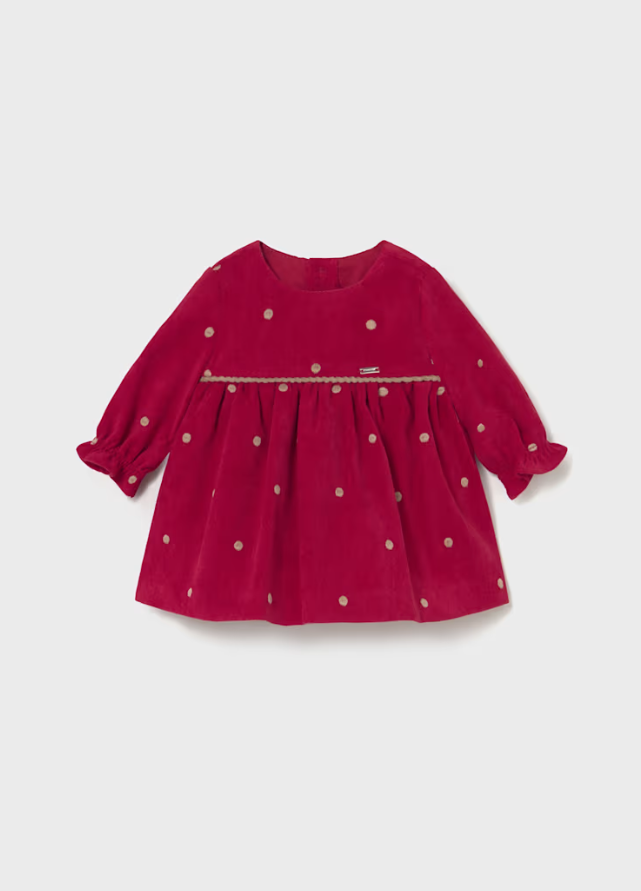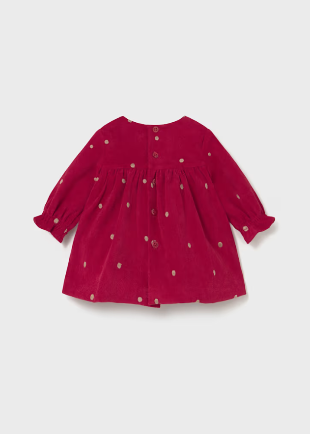 Long sleeved Dress with elasticated cuffs for newborn. Round neckline. Combination of different fabrics to achieve a unique and special design. Patterned design.