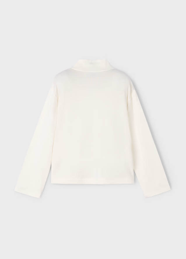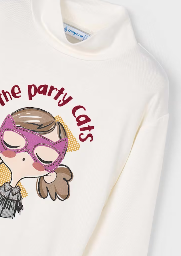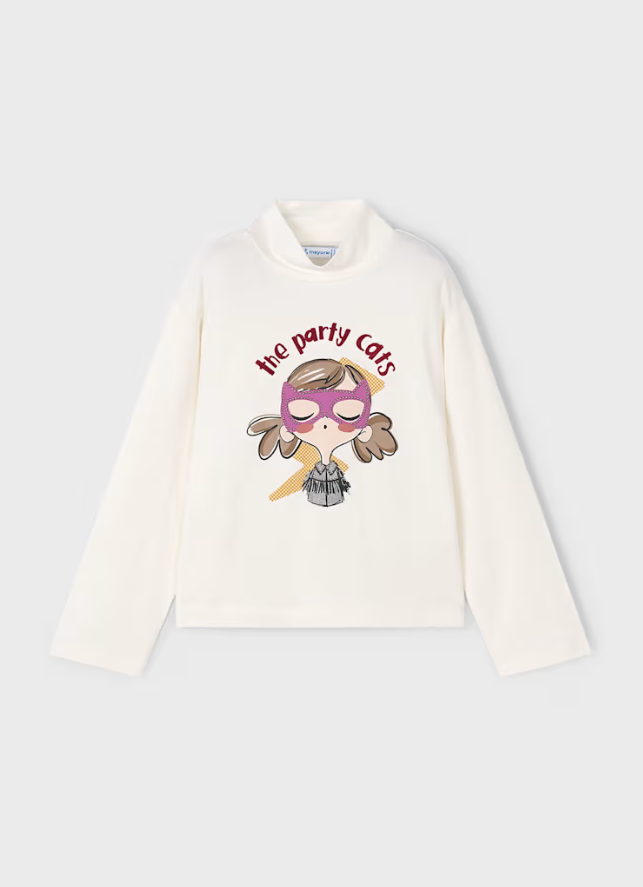 Long sleeved T-shirt for girl. High neck collar. Elastic, flowing fabric for maximum comfort on a day to day basis. Decorative elements: studs, Print.