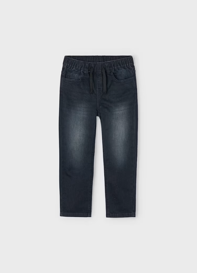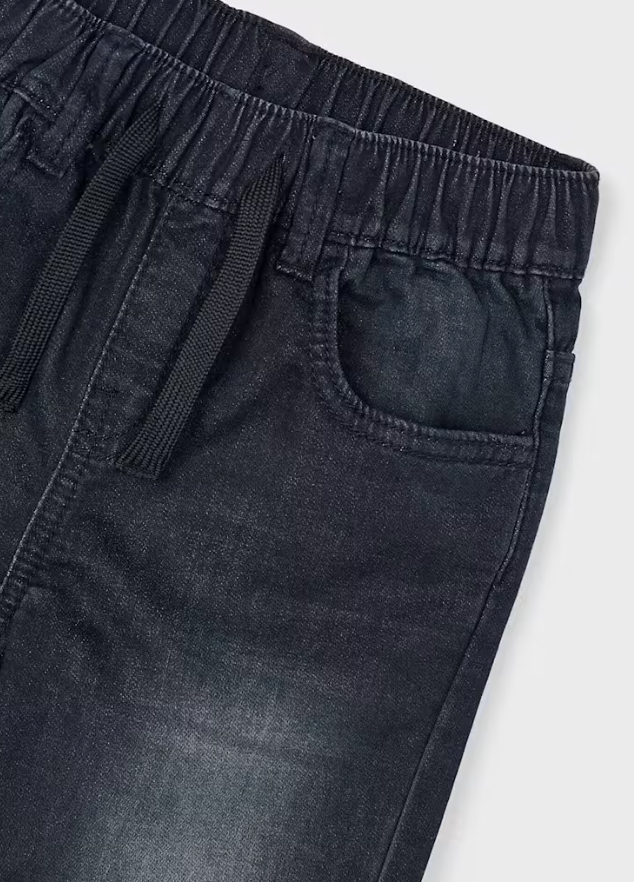 Joggers for boy, baggy at the top but narrower towards the ankle. They are perfect for sporty looks, reflecting the influence that sport has on everyday fashion. Elasticated waistband with adjustable drawstring. Made from comfortable denim fabric, perfect for everyday looks.