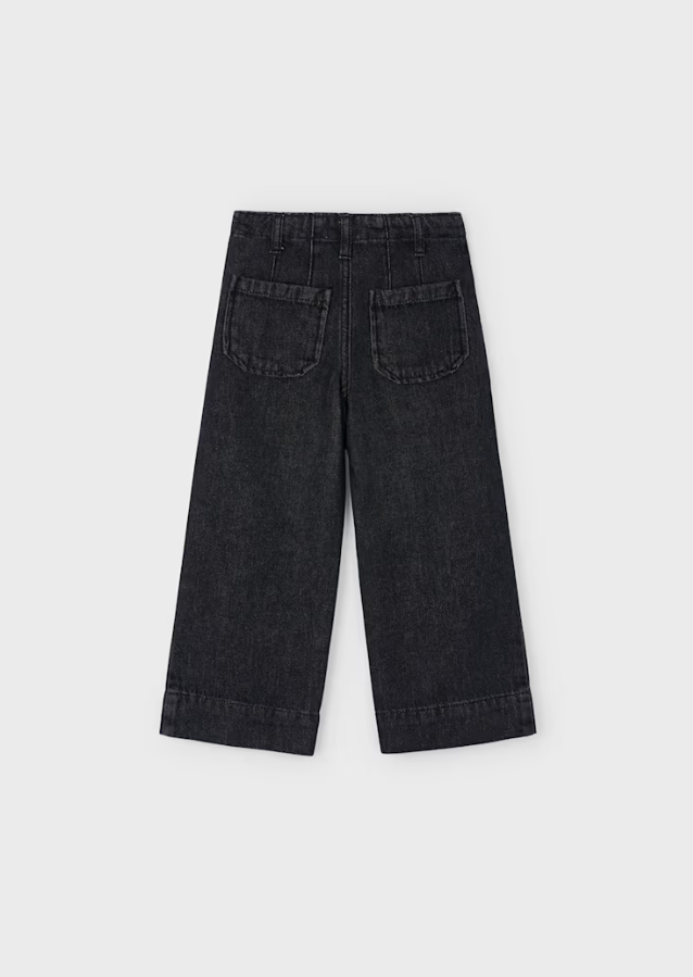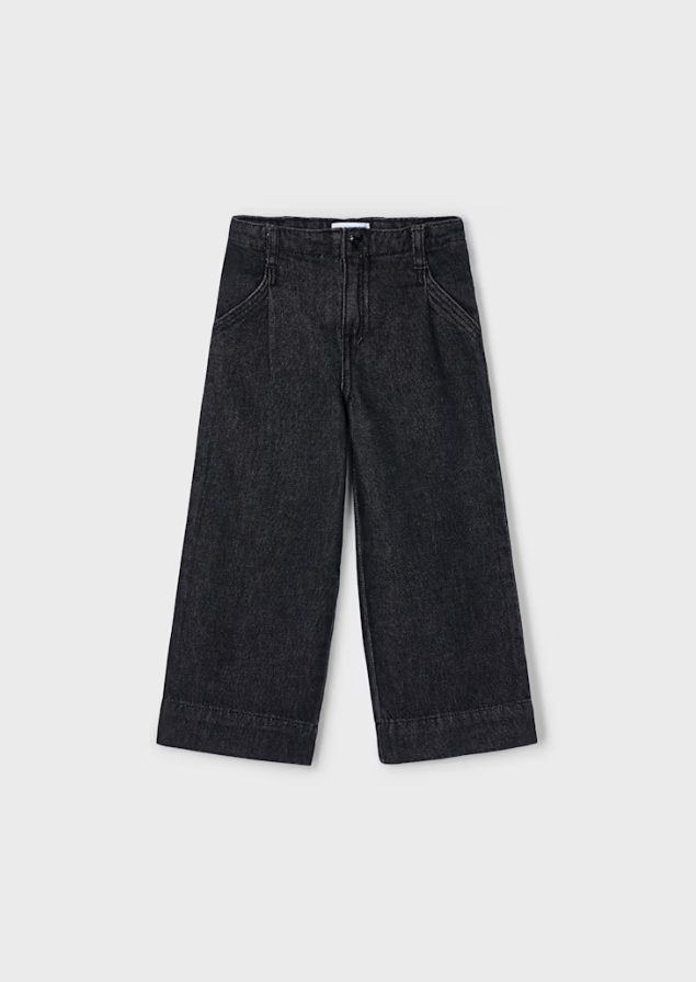 Flared style trousers for girl, wide at the bottom. Adjustable elastic with buttons on the inside of the waistband for a better fit. Made from comfortable denim fabric, perfect for everyday looks. Pleated design. Functional front pockets.