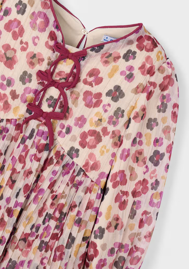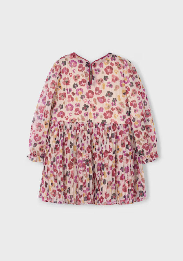 Dress long-sleeved for girl with ruffle on the sleeve. Round neckline. Small opening on the back with a button fastening to allow the garment to be put on easily. Soft polyester inner lining. Gathered and ruffled design. Decorative elements: Bow. Patterned design.