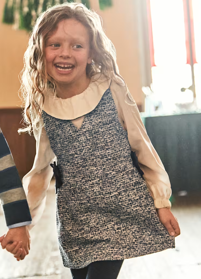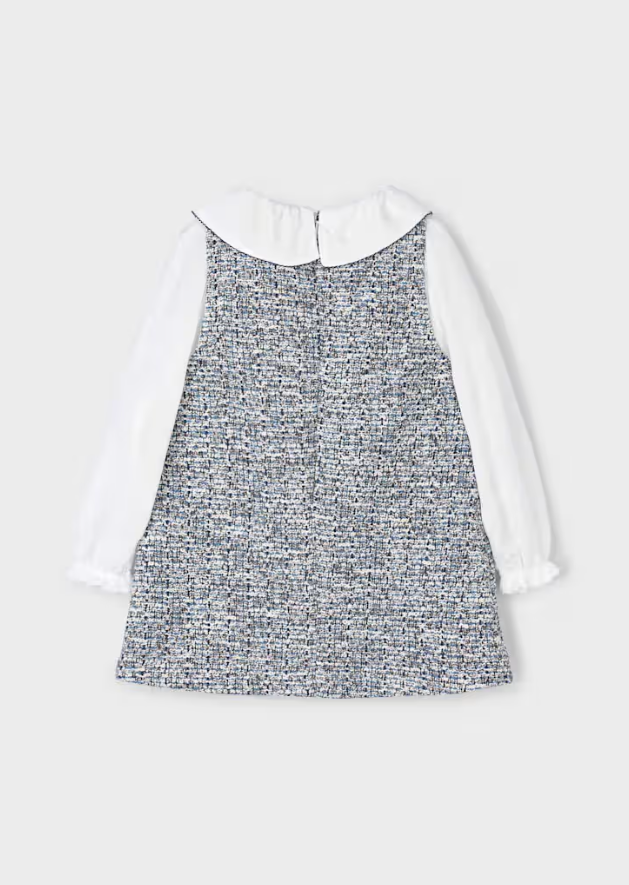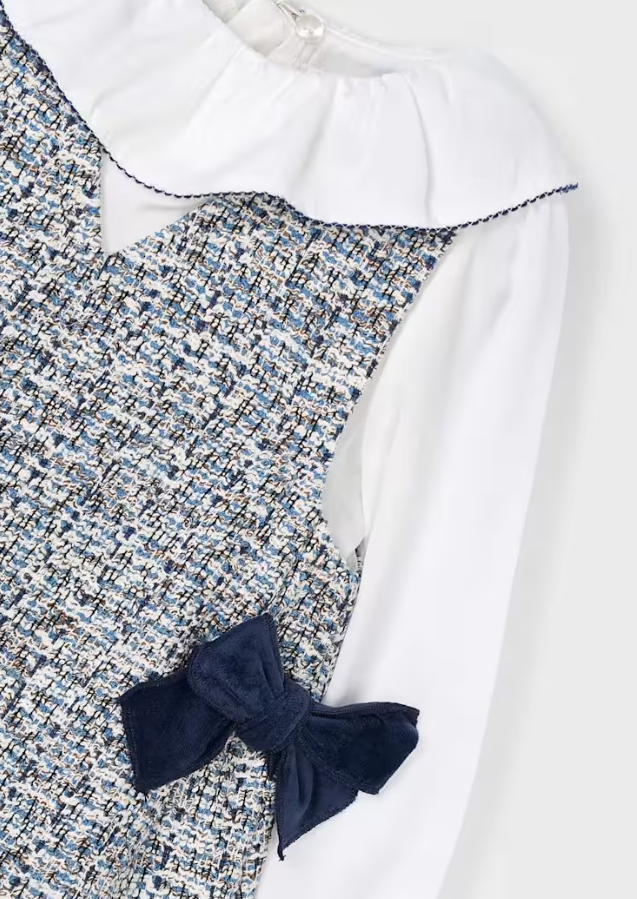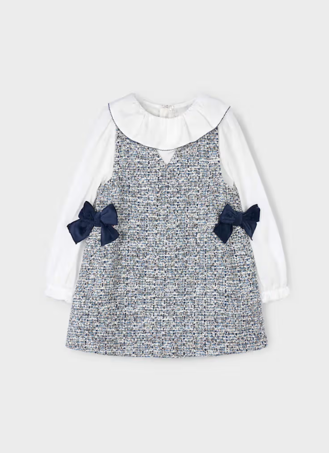 Dress long sleeve garment with elasticated cuffs on the inside. Baby neck. Zip fastening on the back for a quick fit. Combination of different fabrics to achieve a unique and special design. Includes an inner lining. Decorative elements: applique bows.