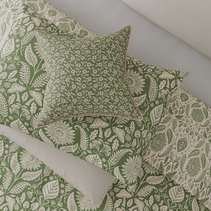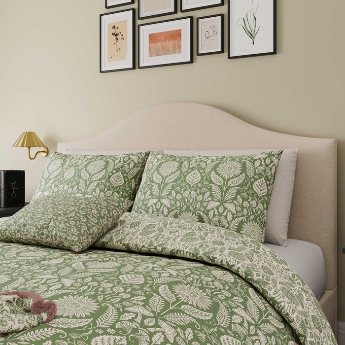 A lively sunflower and floral design is displayed all over this duvet set in vibrant green with the same design reversed on the underside.