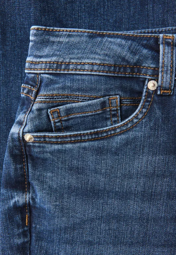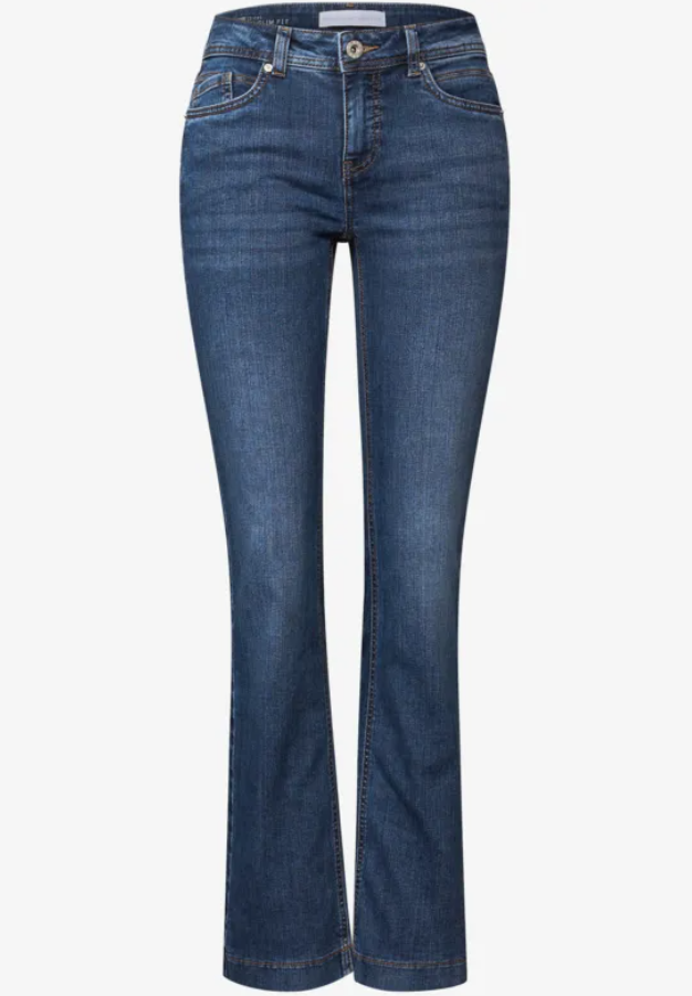 These bootcut jeans from Street One for women combine a figure-hugging slim fit with fashionable bootcut legs. The blue wash creates a classic denim look, while the cotton blend with stretch ensures a high level of comfort. The mid-waist and 5-pocket style make these jeans a versatile all-rounder for your everyday life.