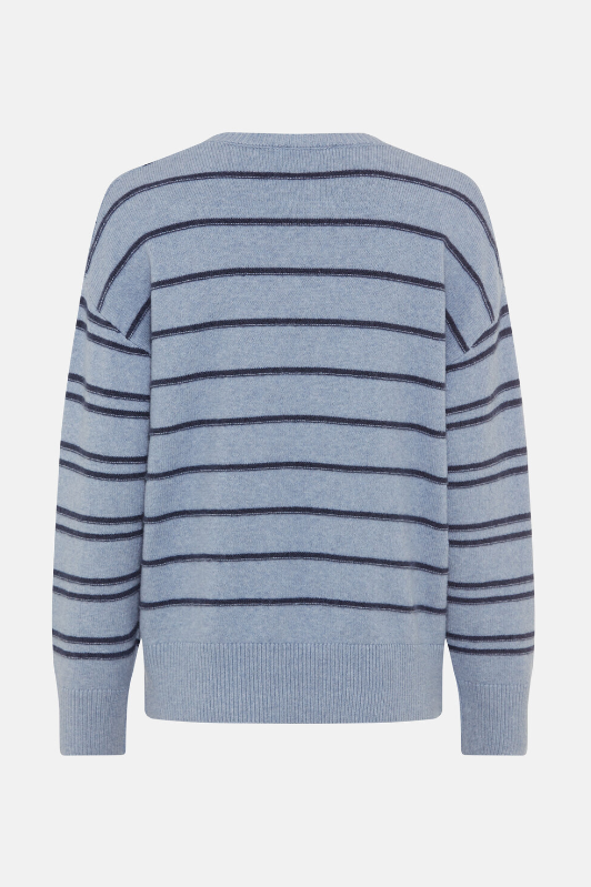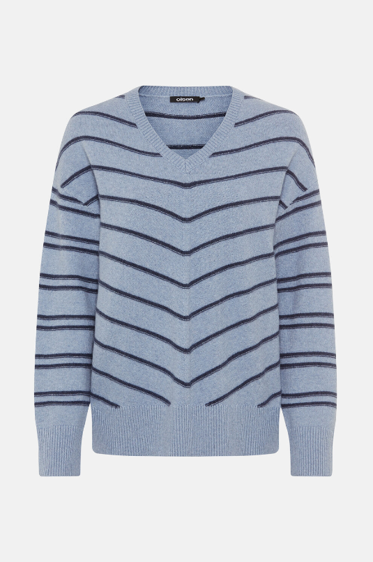 This sweater brings a fresh twist to your wardrobe. The V-neck and dropped shoulders create a modern silhouette, while the striking striped design adds a fashionable accent. The wide Cora fit is pleasantly loose and comfortable. The stretchy cotton blend offers both flexibility and shape retention. The length is approximately 58 cm.