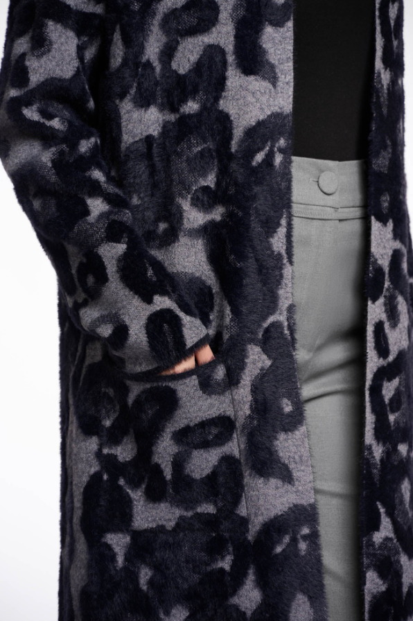 Long knitted cardigan. This medium length cardigan features a leopard print, two front pockets and a playful print. This essential piece is easy to combine for an everyday look.