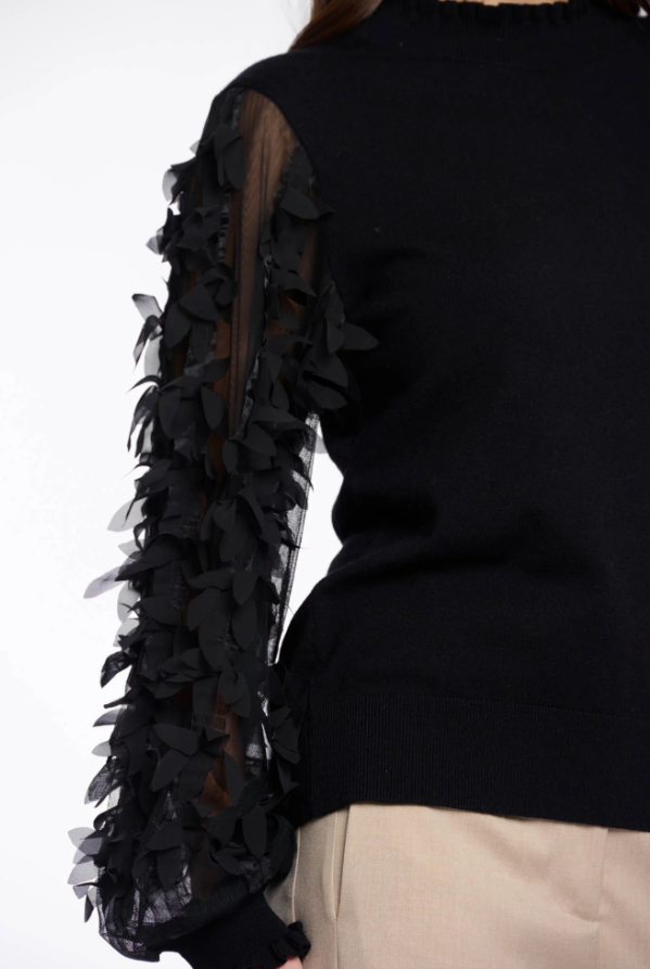 This Romi sweater is the perfect blend of warmth and delicate detail. With its airy mesh sleeves, artfully adorned with beautiful flower embroidery, adding a touch of whimsical charm. The round neckline with delicate pleats and knitted cuffs complete this look with a snug and stylish finish.,BR>