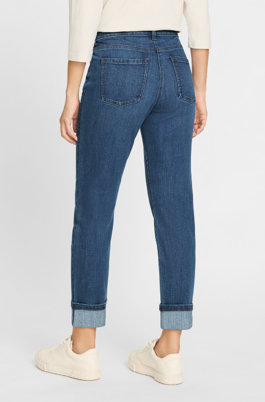 These jeans offer both comfort and a fashionable look. The classic button and zipper closure, along with details like the front design and back yoke, complete the design. The raised rise and comfortable thigh provide additional comfort, while the straight leg elongates the leg and creates a stylish silhouette. The sparkling rhinestones on the turn-up are a highlight. Perfect for everyday wear and versatile combinations, they are made from a cotton blend, ensuring a comfortable fit and freedom of movement. Another plus: the polyester content is made from sustainable REPREVE®, which is made from recycled PET bottles. Length approx. 27 inches.
