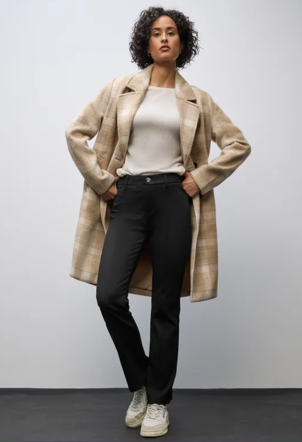 The York-style twill bootcut trousers from Street One for women impress with their figure-hugging fit and flared leg. The high waist and solid color create a modern silhouette, while the stretch fabric offers comfortable wear. A stylish alternative to classic jeans.