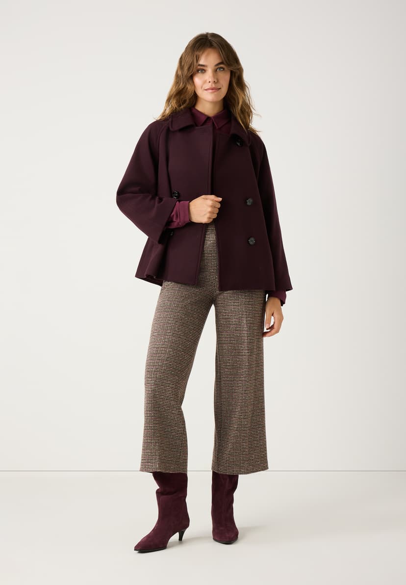 Straight, wide leg with crease, shaping waistband, side zipper, slanted pockets, comfortable to wear thanks to a stretch component