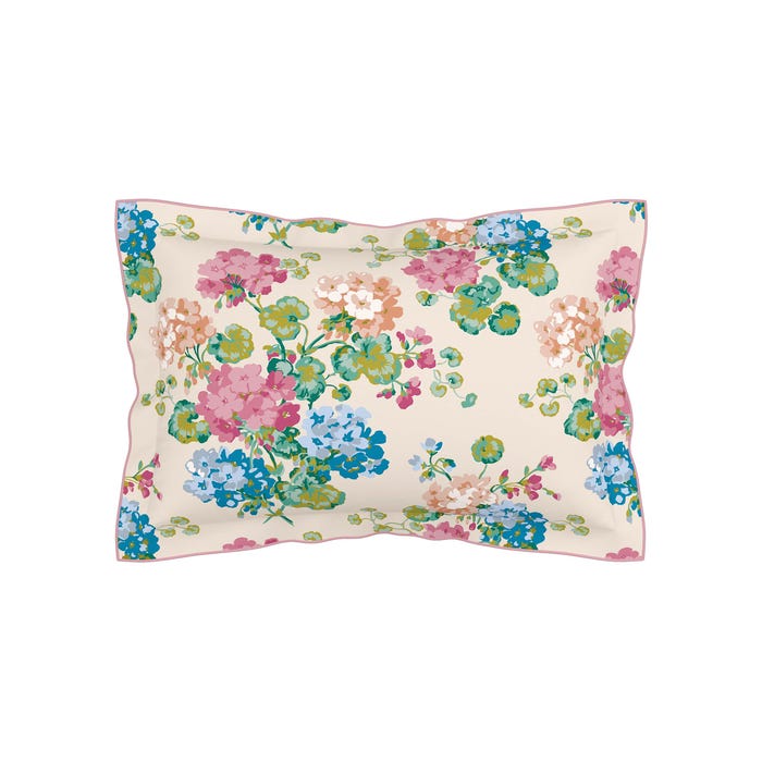 A beautiful vintage feel floral design duvet set in pops of blue, pink and green. The reverse displays an intricate dotty, floral print for added interest. Complete the look with the crewel stitched leaf design cushion in pink, finished with blue piping on all four sides.