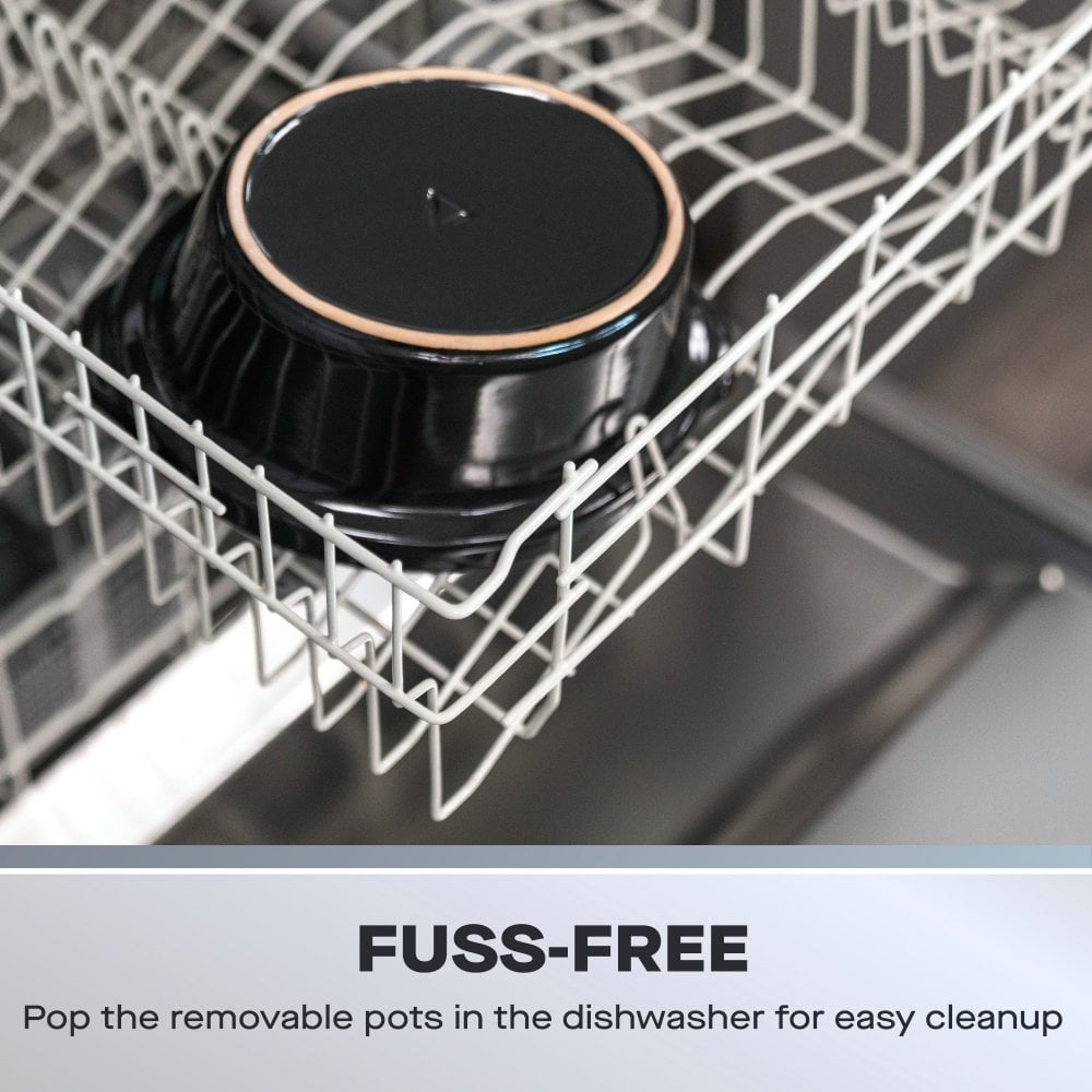 3x 1.5L non-stick ceramic pots, 300W power, Up to 82% cheaper to run than traditional ovens, Great for parties and gatherings, Individual heat controls for each pot, Cool touch handles, 3 cooking settings (high, low, keep warm)