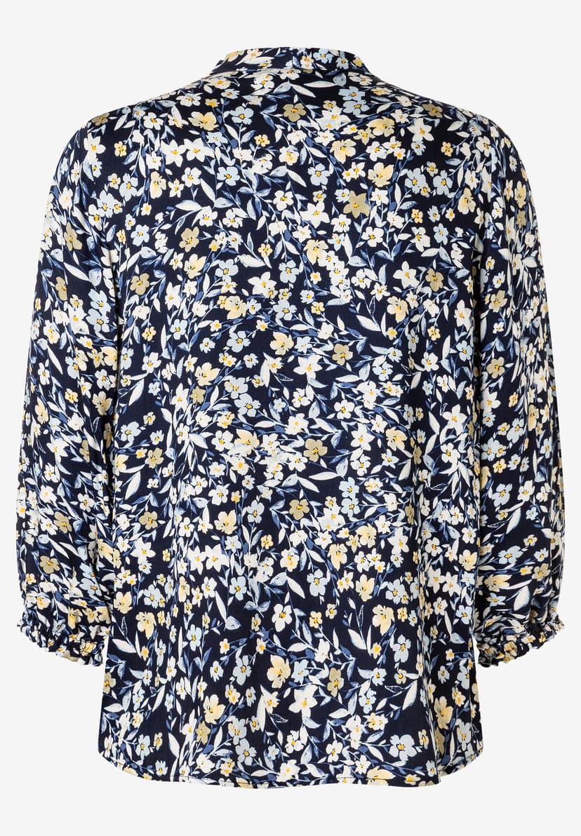 Loose slip-on shape, Small V-neck and pussy bow collar, 3/4 length sleeves with elastic at the endFlowing viscose quality with enchanting millefleurs print