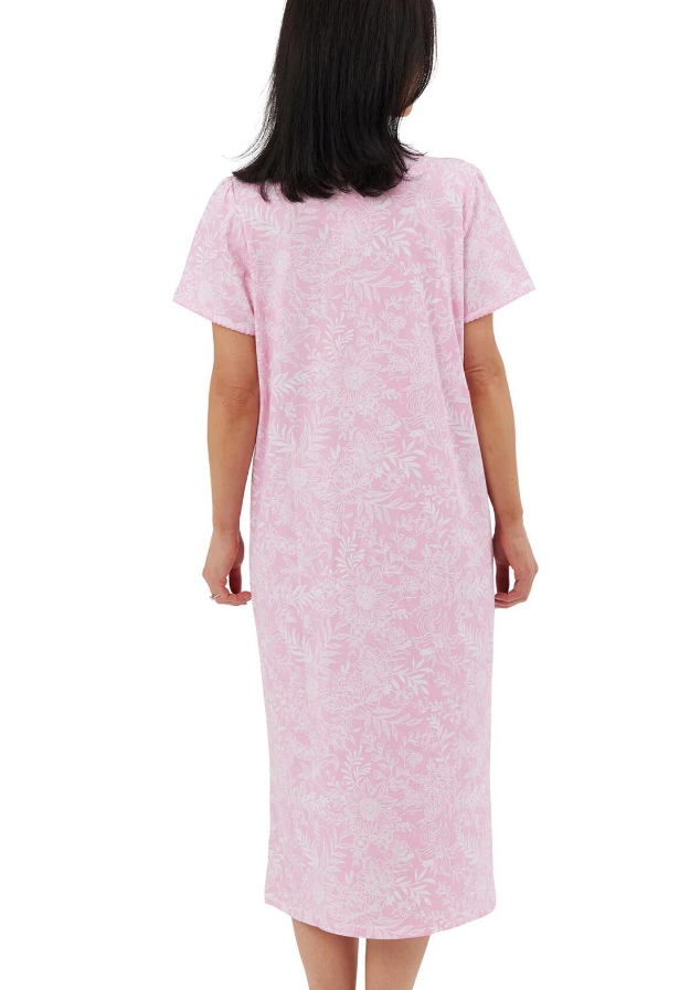 Indulge in comfort with our 40" Marlon Linear Floral Pink Short Sleeve Nightdress, ideal for those seeking shorter sleepwear. This charming nightgown features a subtle white floral design on a soft, pastel backdrop.