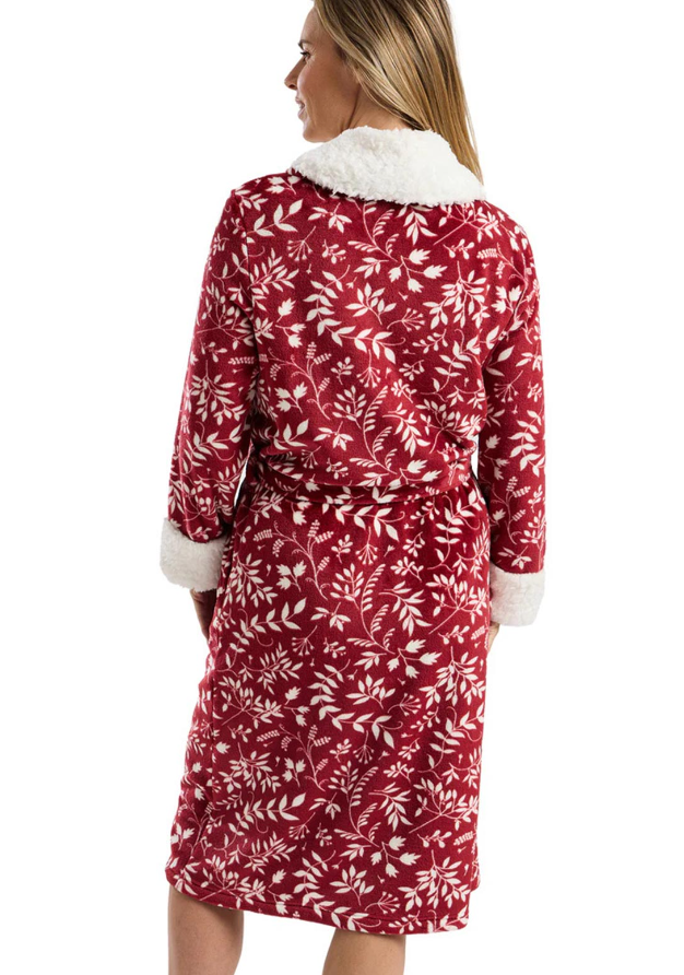 Experience daily comfort with our Marlon Leaf Print shawl collar fleece dressing gown, designed for stylish relaxation at home. Made from soft, silky fleece with a smooth texture, this robe provides cozy warmth and a flattering silhouette. Plush Sherpa fleece trims the shawl collar and cuffs, enhancing both luxury and snugness. Featuring an elegant white leaf pattern, this gown adds a natural, graceful touch to your leisure moments.