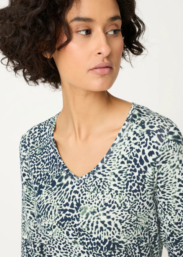 A feminine basic with charming details: This V-neck top features an all-over print that gives the look a fresh and modern touch. Made from pure, soft cotton, it feels wonderfully comfortable against the skin. Cut in Olsen's "Edda" fit, it has a close, fitted silhouette – perfect for everyday wear and leisure.