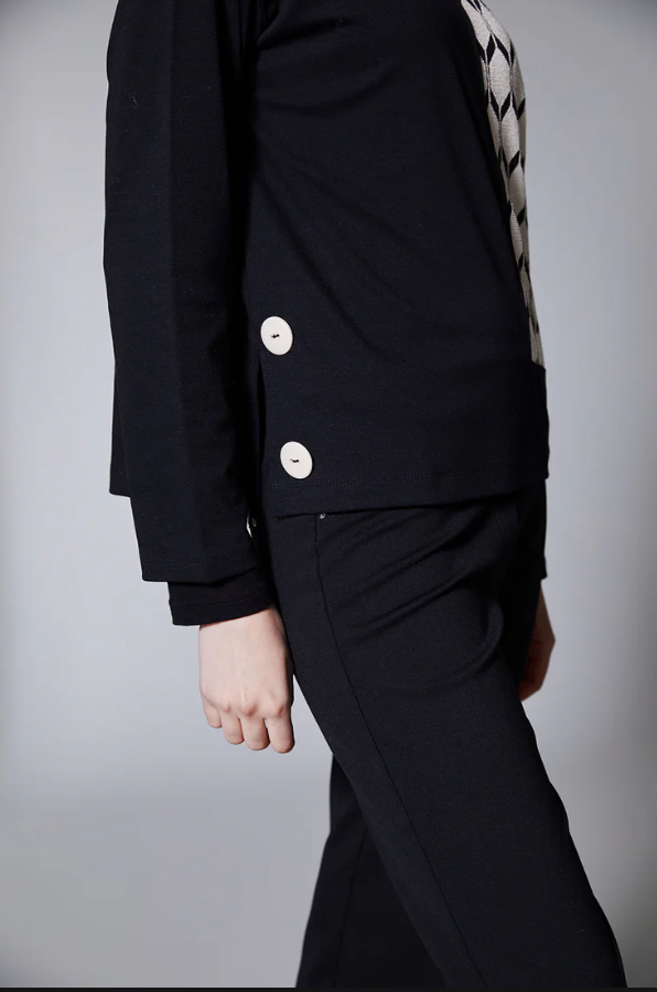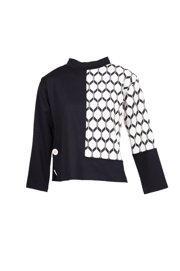 The Peruzzi Hexagonal Jacquard Knit W25181 is a chic monochrome piece, perfect for elevating your everyday style. Featuring a striking black and ecru hexagonal jacquard pattern and finished with long cuffed sleeves, this knit offers both comfort and contemporary flair. Ideal for pairing with trousers or skirts, it’s a versatile addition to any wardrobe.