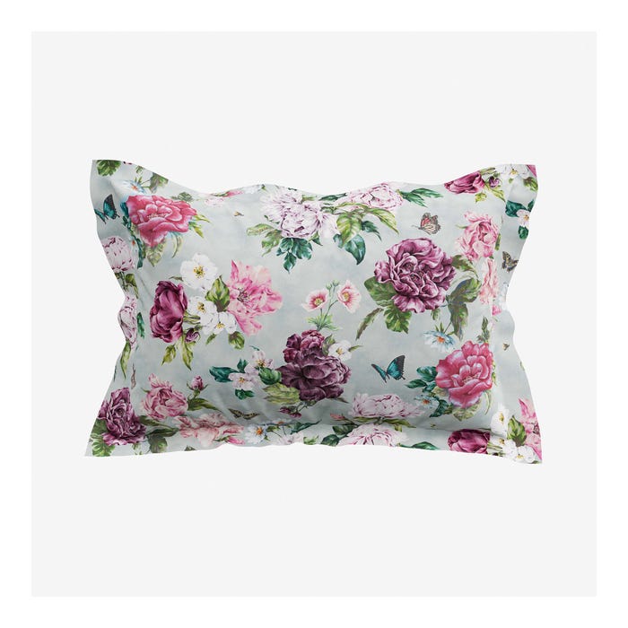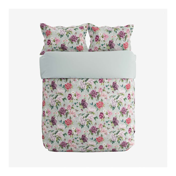 Rich, abundant peonies, delicate butterflies, and bees bring this charming cottage garden to life. Boldly coloured, Summer Peony is digitally printed onto cotton percale and complemented by matching Oxford pillowcase(s), with a plain blue reverse.