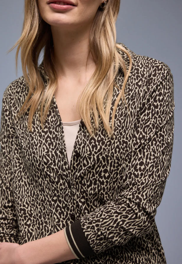 This leopard-print shirt from Street One for women brings a blouse-like feel to your everyday look. The shirt collar, button placket, and ribbed cuffs create a trendy blend of classic and sporty. The soft cotton-modal blend is comfortable to wear – a true favorite for individual style.