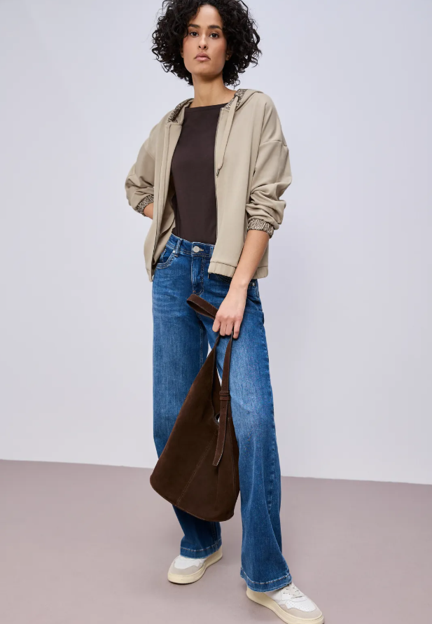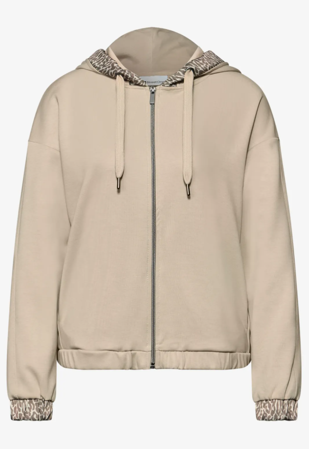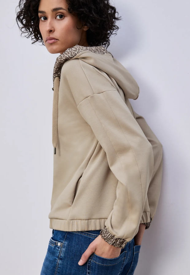 This women's hoodie jacket from Street One combines sporty style with feminine elegance. The silky sheen and leopard print accents on the hood and cuffs give it a distinctive look. Side pockets, an elasticated hem, and a stretchy modal blend make it your new favorite piece for casual everyday moments.