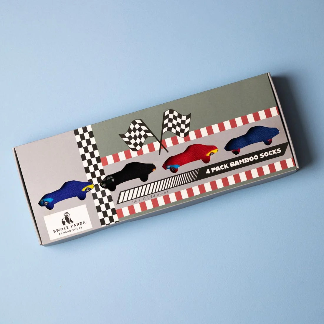 Are you looking for a unique present? Treat yourself or somebody special to this racing car style gift box filled with four pairs of our bamboo socks. One pair each of Blue Cars, Black Cars, Red Cars and F1 Cars. Each pair is knitted from our unique bamboo blend offering the subtle touch of stand out style.