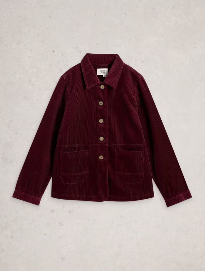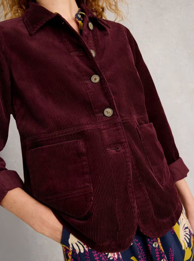 CARRIE CORD LONG SLEEVE JACKET IN DK PLUM €115.00 4.4 out of 5 stars, average rating value. Read 114 Reviews. Same page link. (114) DARK NAVY swatch DUS GREEN swatch DK PLUM swatch SIZE GUIDE 6 8 10 12 14 16 18 20 22 24 REGULAR PETITE ADD TO BAG DETAILS If you were looking for the cherry-on-top to complete your outfit, this might be it. Our cherry pink corduroy jacket is made with soft organic cotton. (And it looks great with wide leg jeans.)