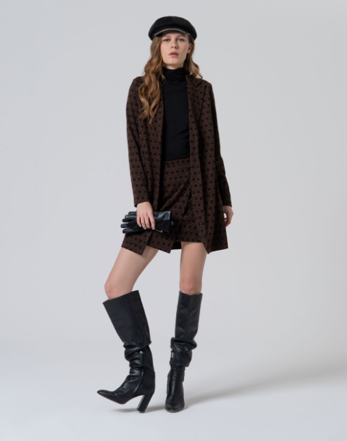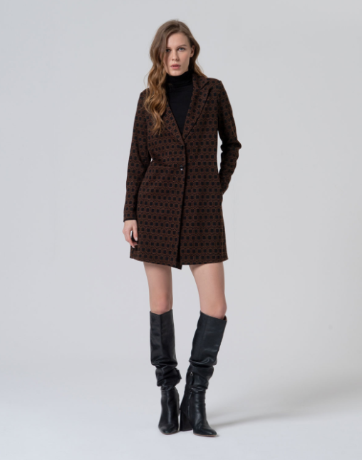 Retro geometric print frock coat with single button closure and slim fit design that slims the figure. Made in a soft and comfortable elastic fabric, ideal to combine with other garments of the series or to give an original touch to your more sober look