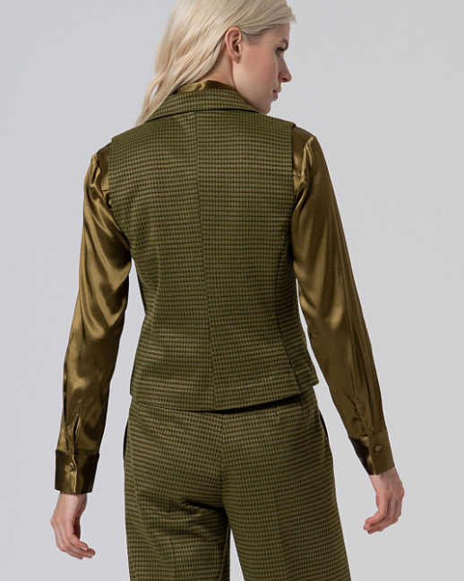 Fitted double-breasted vest with sleeveless design and houndstooth print. Elegant and feminine, ideal to combine with a shirt or just as a top. Its slightly elastic fabric provides comfort and structure, elevating any outfit with a classic and modern look