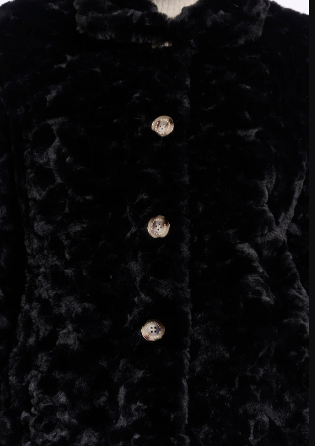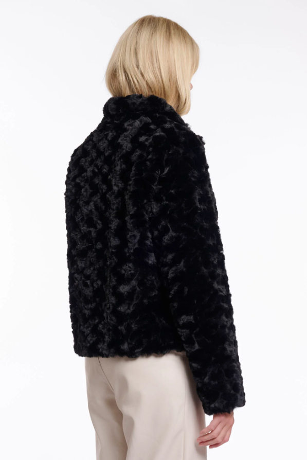 Stay cozy in this short faux-fur jacket with a soft wave-textured finish. Designed with a fold-over high neck, button closure and hidden side pockets. A playful yet sophisticated piece that wraps you in comfort and style.