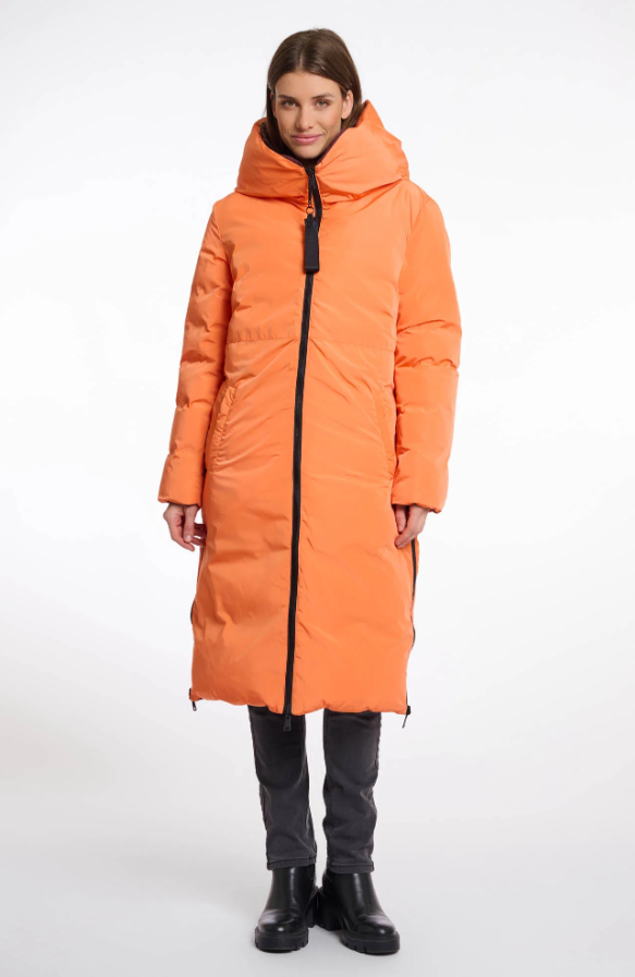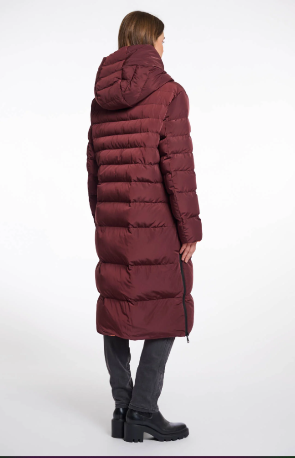 Stay both warm and stylish with this long long women's coat. The Keila coat is padded and reversible, providing you with two unique looks in one. The design features a convenient two-way zipper closure, side slit pockets with snap button closures and a high neck collar with a hood for comfort. This coat also includes slit zipper details on both sides, allowing you to move freely while keeping you warm. You won't want to leave home without this must-have coat.