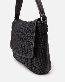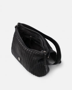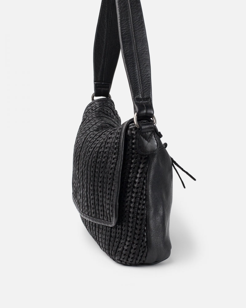 Washed and vegetable-tanned cowhide leather hobo bag. Frontal laser-made spikes decoration. Shoulder handle and removable crossbody strap, zip closure, external and internal pockets, and cotton lining.