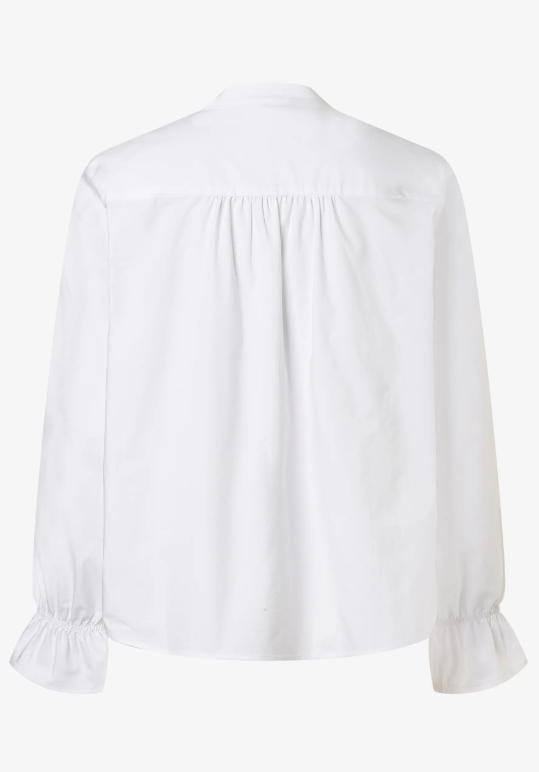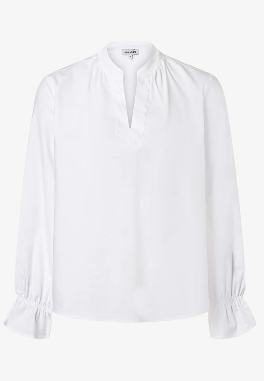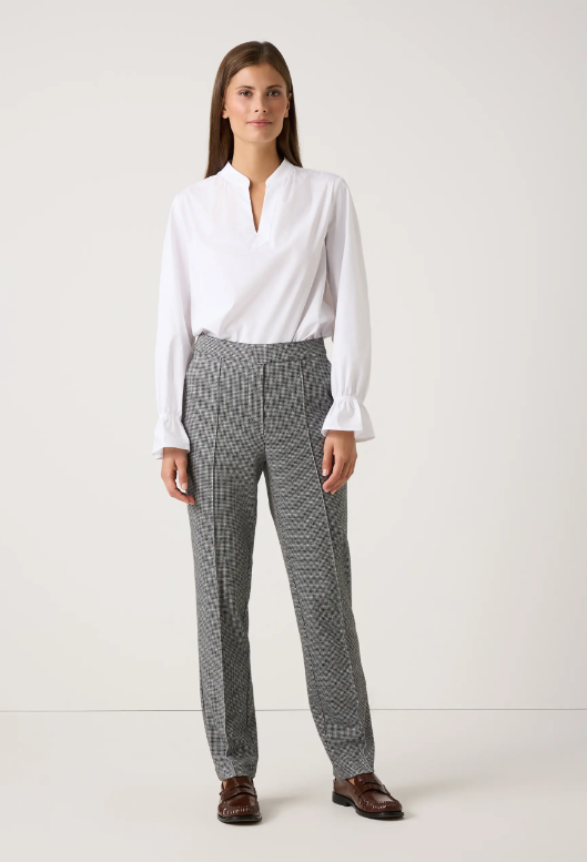 This feminine cotton/stretch blouse by MORE & MORE with a small stand-up collar and V-neck looks equally good under blazers and cardigans and also looks great on its own with jeans.
